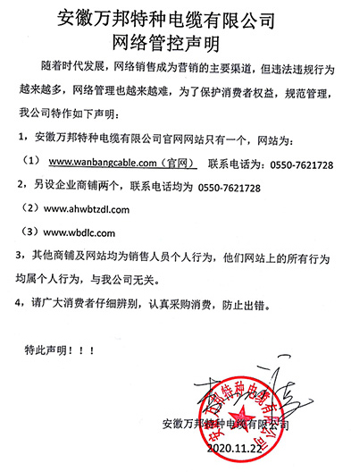 鄭重聲明:安徽萬邦特種電纜有限公司官方網站為:www_wanbangcable_com.fsslqh.cn,除此之外無任何子網站或合作網站,其余均為假冒偽劣。電話:0550-7621728 13485756353 地 址:安徽省天長市滁州高新技術產業開發區經四路29號